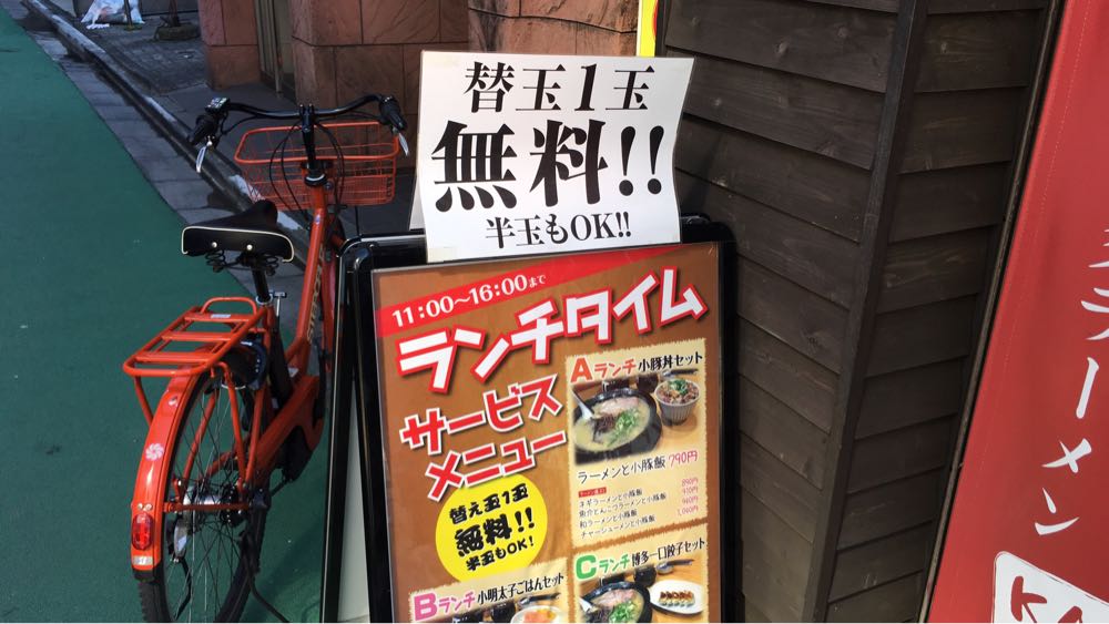外観はわかりやすいので近くにくるとお店を見逃すことはないでしょう。入り口の外にある替え玉一杯無料の看板が目を引きます。